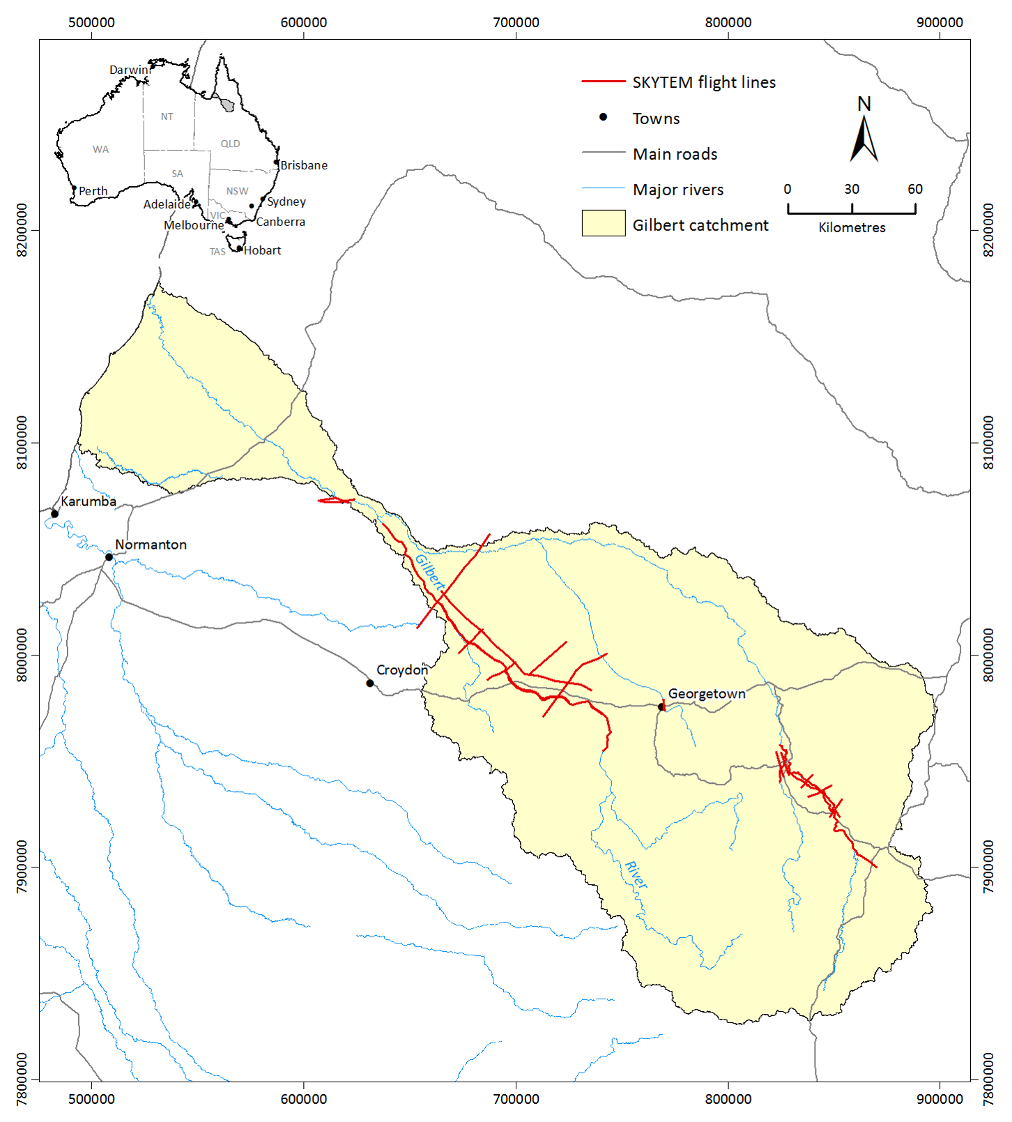 CSIRO’s FGARA project gathered electromagnetic (EM) geophysical data via helicopter over select flight lines of both the Gilbert and Flinders catchments. The flight lines were focused along main rivers and areas were water storage options were suggested.