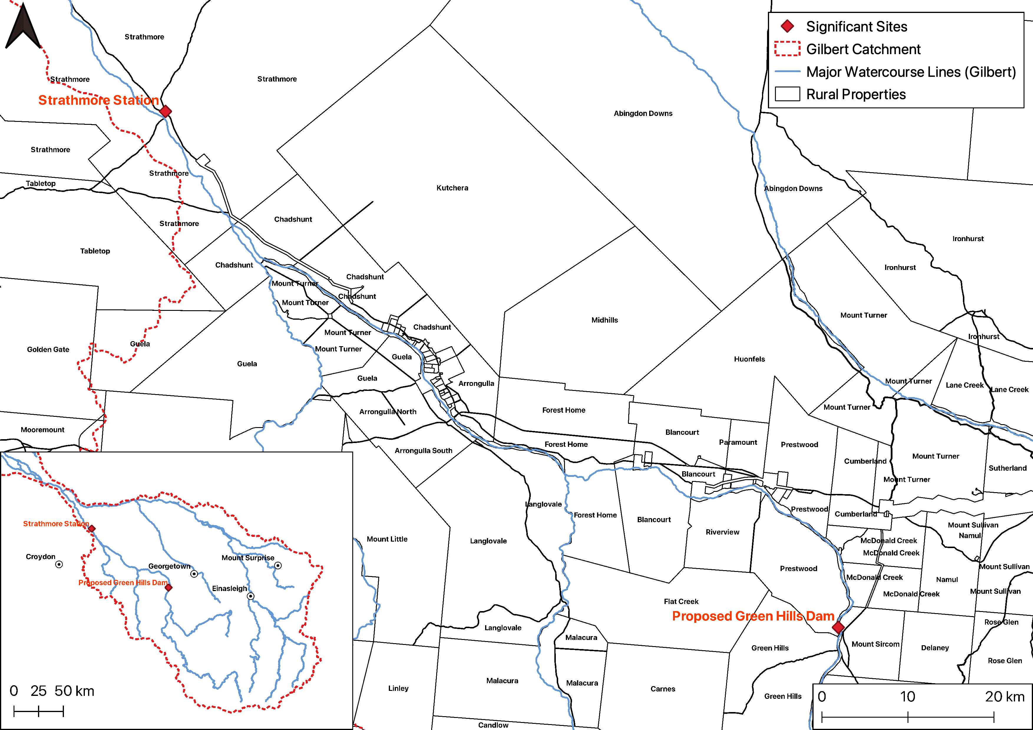 The proposed Green Hills dam, an in-stream dam on the Gilbert River, was the focus of a detailed business case published in 2020. The dam, if built, would service the Gilbert River Agricultural Precinct, expanding irrigated agriculture in the area.